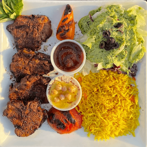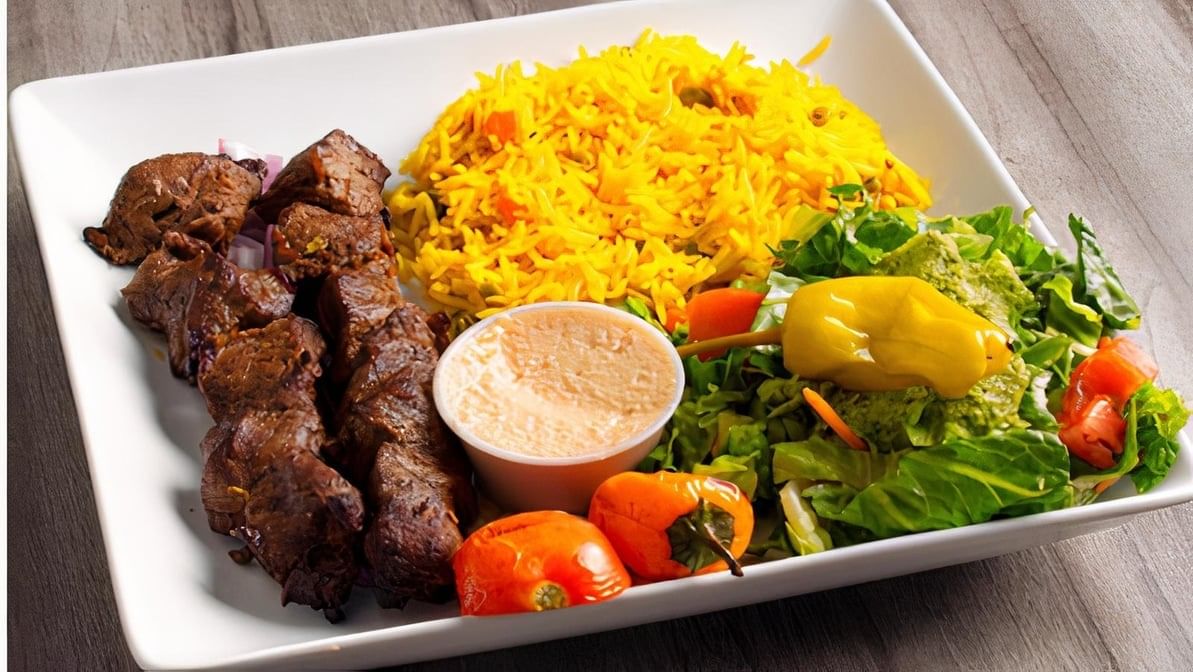 Beef kabob, hummus, tomatoes, and amba wrapped in shrak. Served with rice and Mediterranean salad