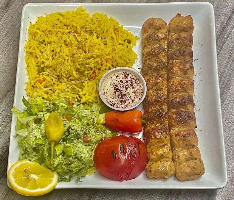 2 beef kabob + 2 chicken tikka+ 2lamb tikka 2 hala ground chicken kabob come with rice +salad +hummus