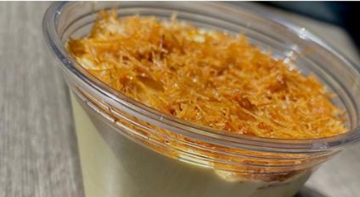 Mixture of cream caramel, whipped cream, ritz crackers, and milk topped with crispy angel hair noodles
