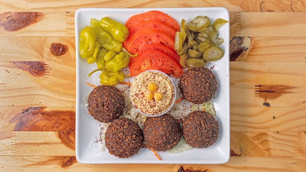 Chickpea fritters, hummus, tomatoes, and pickles