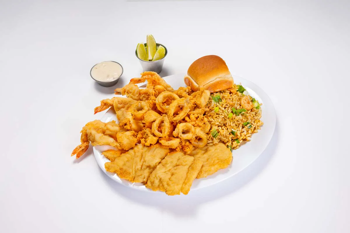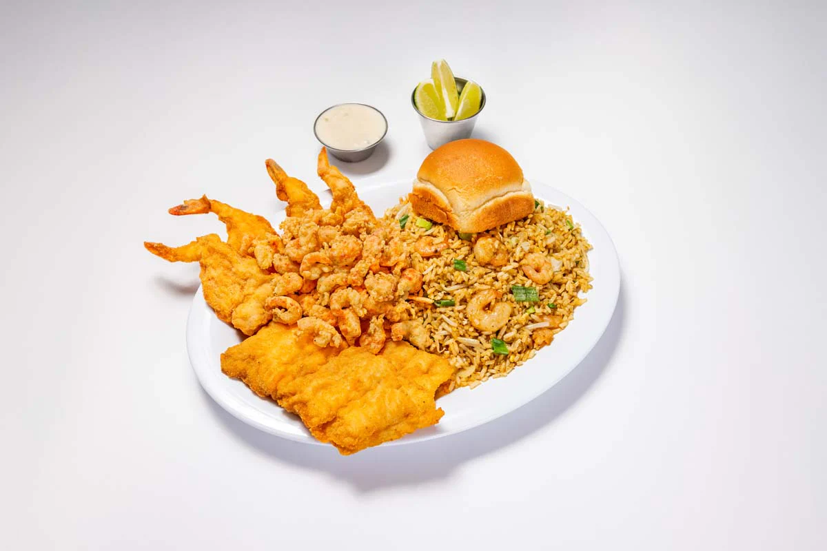 Serves up to 10 people 55 fried medium shrimp, 14 fried fish fillets, special fried rice, french fries, 10 buns