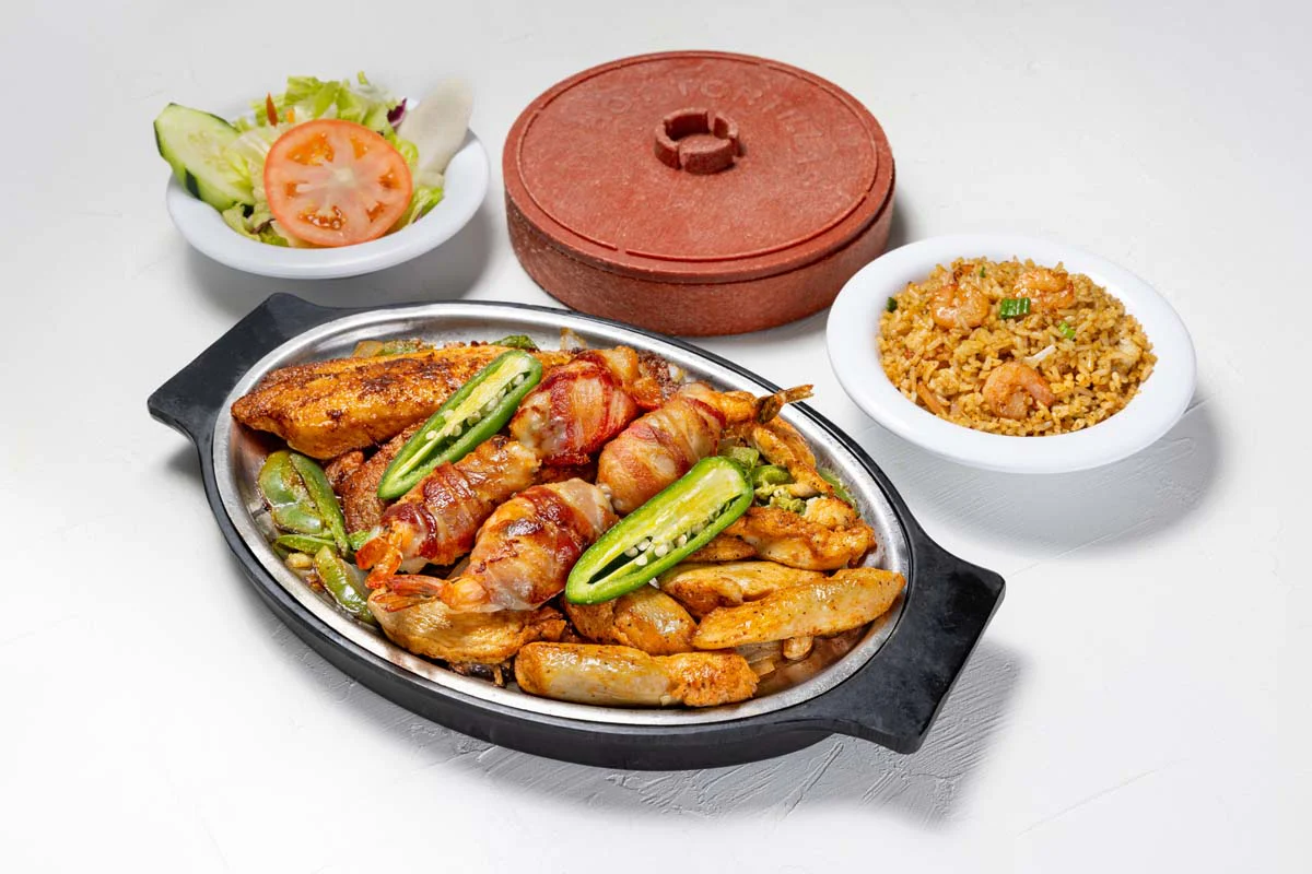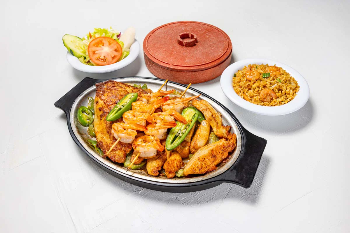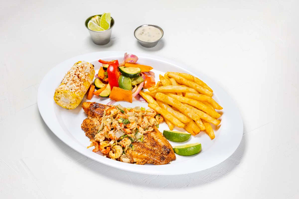 Grilled Chicken, 4 Bacon Wrapped Shrimp, and 1 Tilapia Fillet. Served with grilled jalapeño, fresh mixed vegetables and tortillas. Choice of 2 sides.