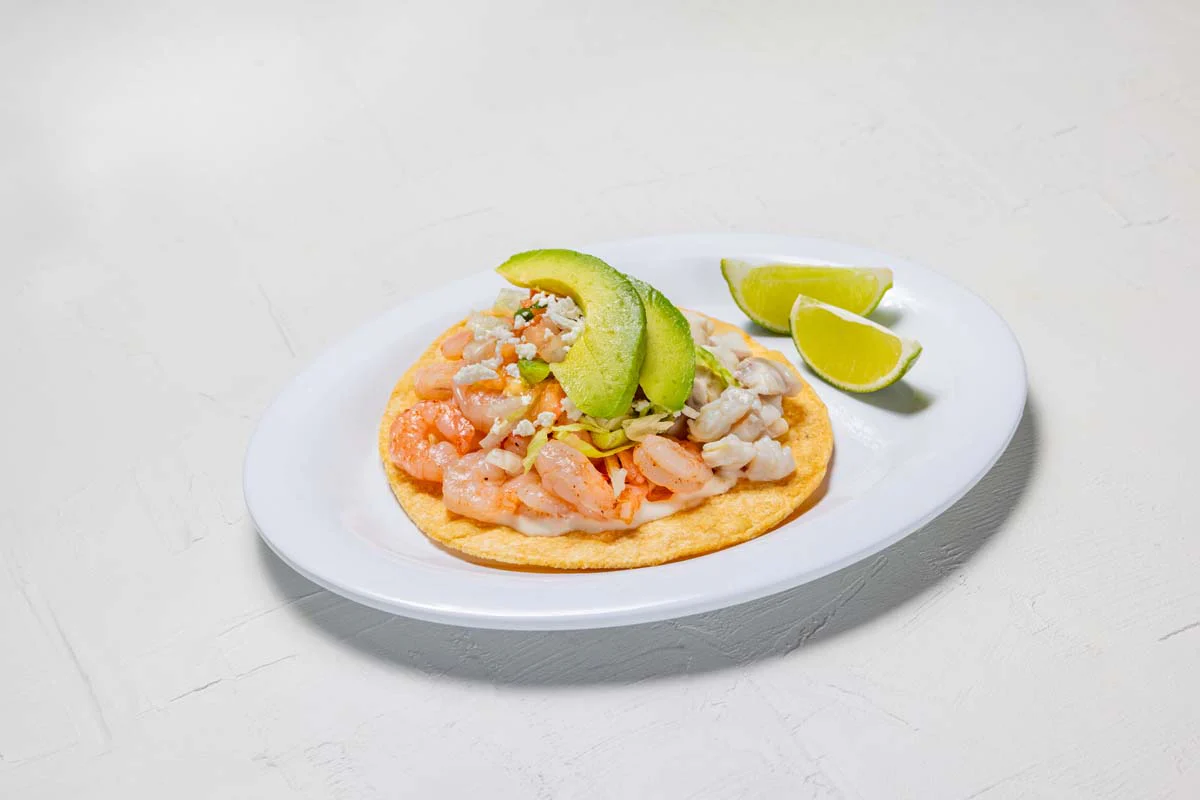 A fried tortilla topped tartar sauce, with a choice of fish, shrimp or combination topped with shredded lettuce, pico de gallo, cheese and avocado
