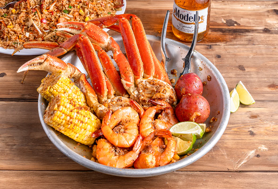 Boiled shrimp tossed in butter with roasted garlic and Mambo seasoning. May add potatoes and corn for additional charge.