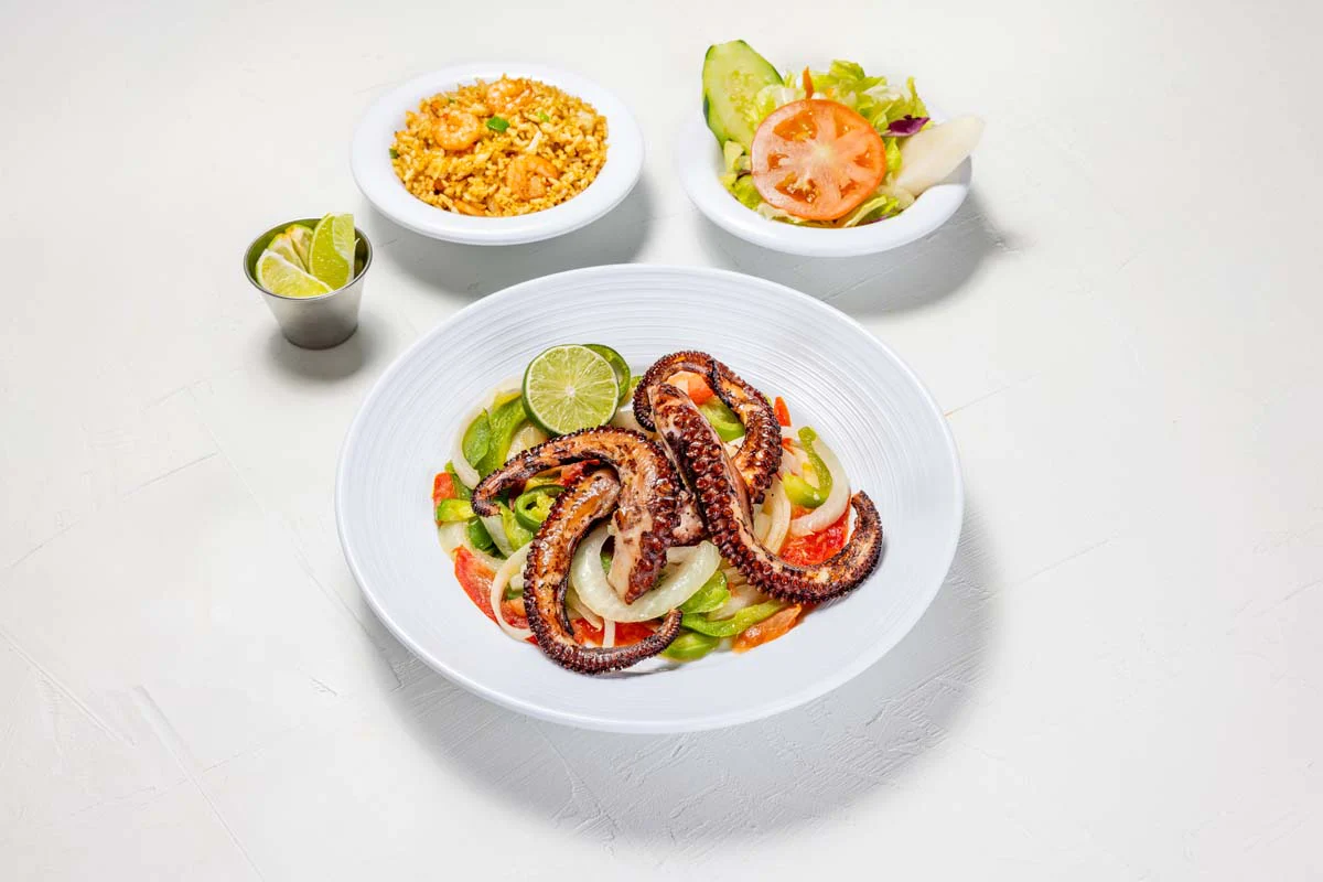 Headless whole grilled or zarandeado octopus, placed on a hot skillet with sauteed green bell pepper, yellow onion, jalapeño & tomato.