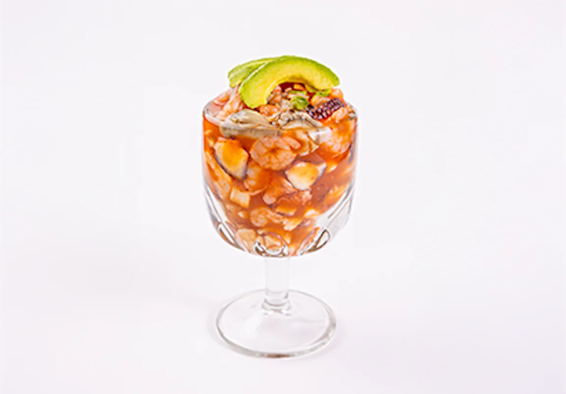 Shrimp, fish, oyster and octopus, pico de gallo, avocado, cocktail onions, and olives.