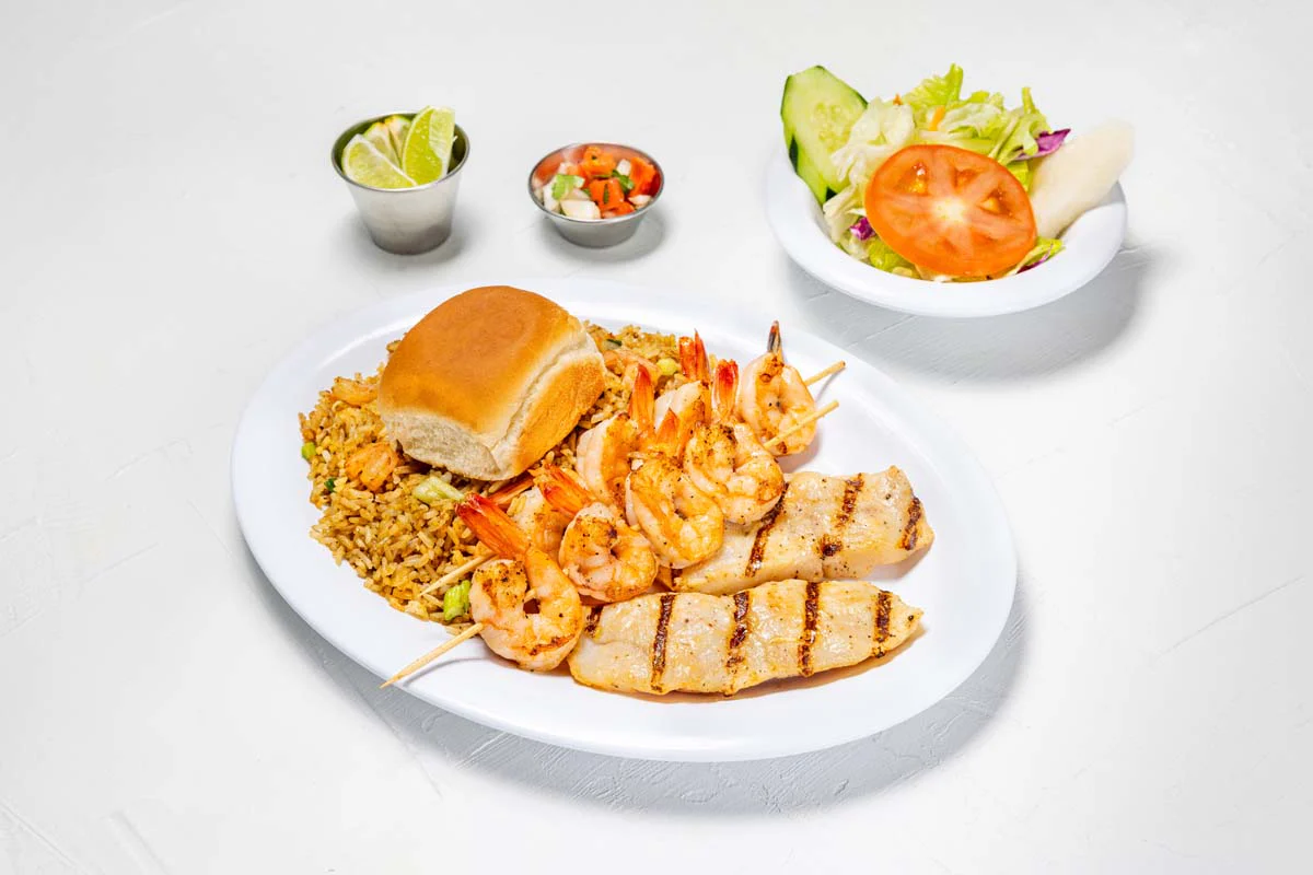 8 Grilled Grande Shrimp, Chicken and 1 Tilapia Fillet. Served with grilled jalapeño, fresh mixed vegetables and tortillas. Choice of 2 sides.