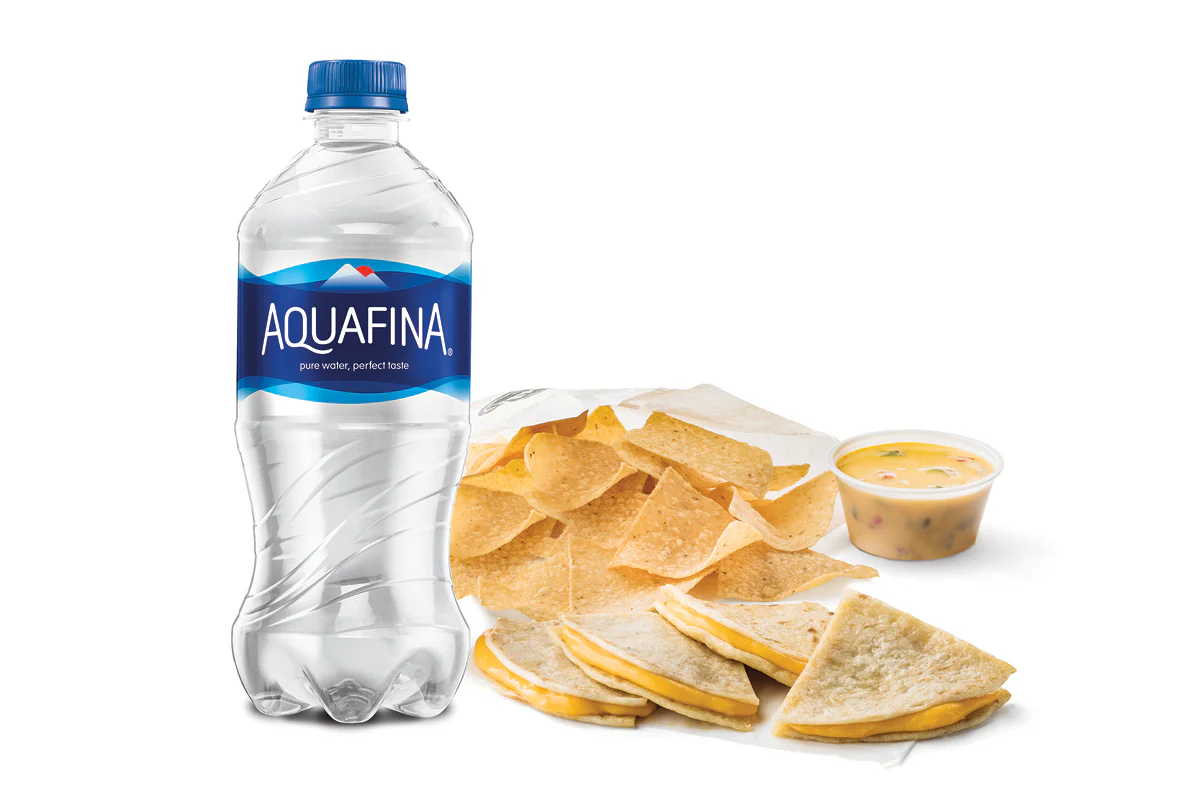 Cheese Quesadilla, rice & beans OR chips & queso, and kids’ drink