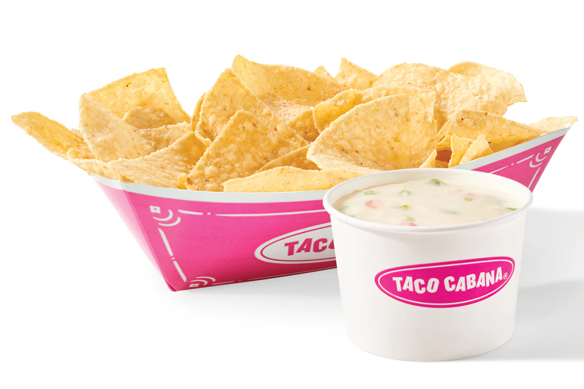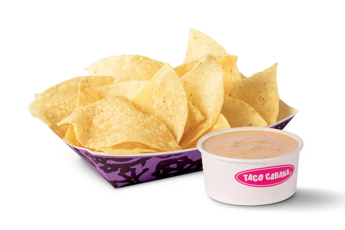 Tortilla chips served with refried beans and queso with a side of sour cream and guacamole. Served with a small drink.