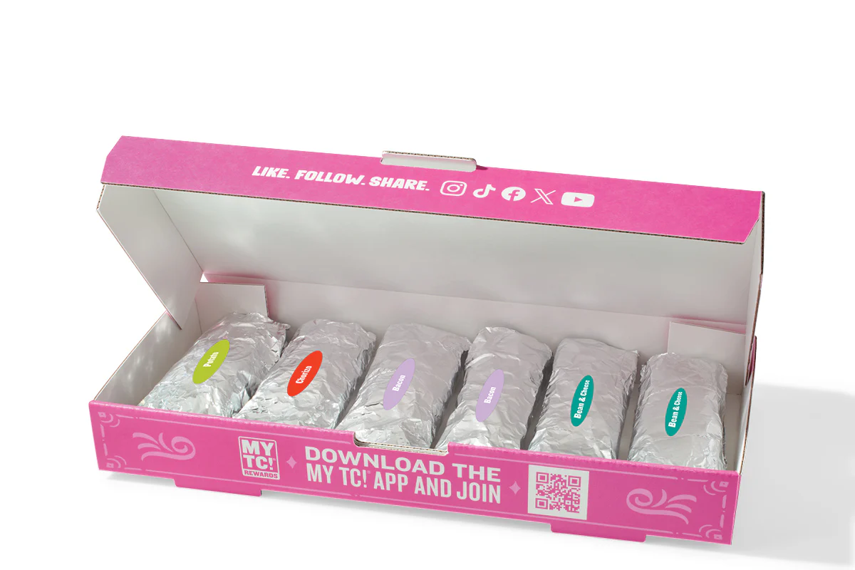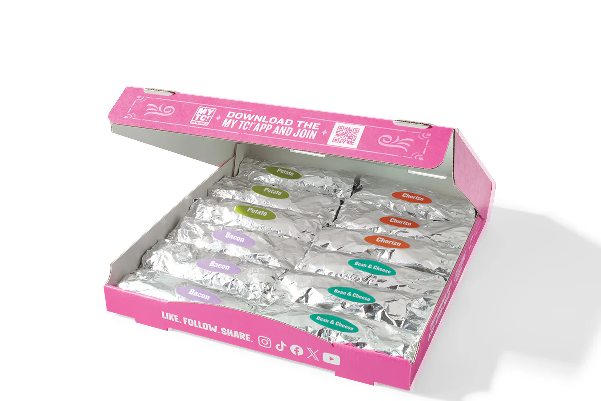 3 Bean & Cheese Tacos, 3 Bacon & Egg Tacos, 3 Potato & Egg Tacos, 3 Chorizo & Egg Tacos