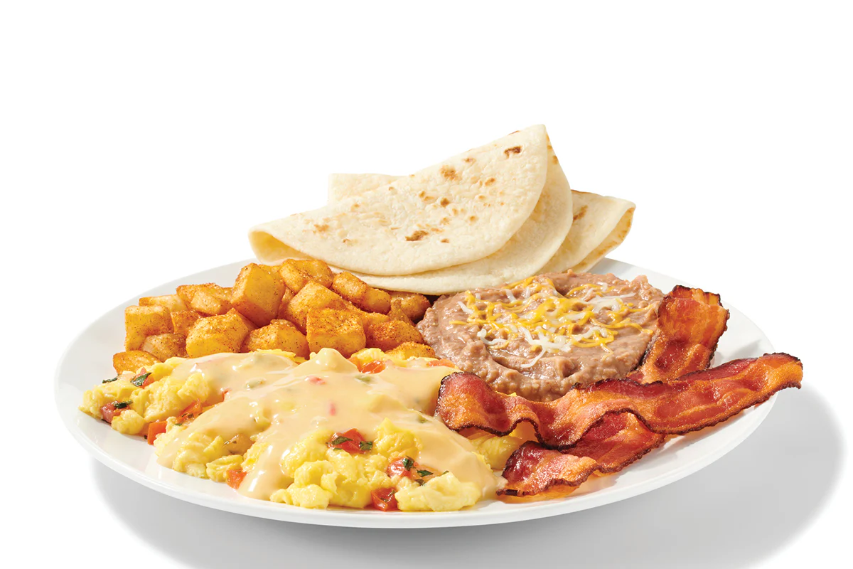Two scrambled eggs topped your way or with steak fajita, pico de gallo, two strips of center-cut bacon, refried beans, seasoned potatoes & 2 flour tortillas.