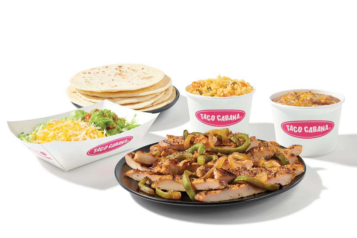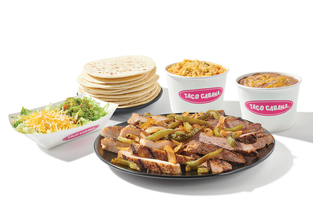 1/2 Order (8 oz) (Chicken Fajita) served with a blend of grilled peppers and onions, 8 oz rice, 8 oz refried or black beans, 6 flour tortillas, shredded lettuce, shredded cheese and guacamole.