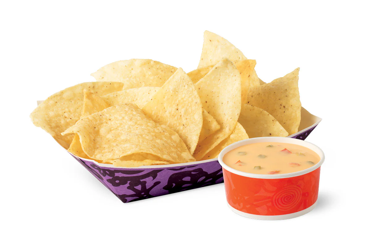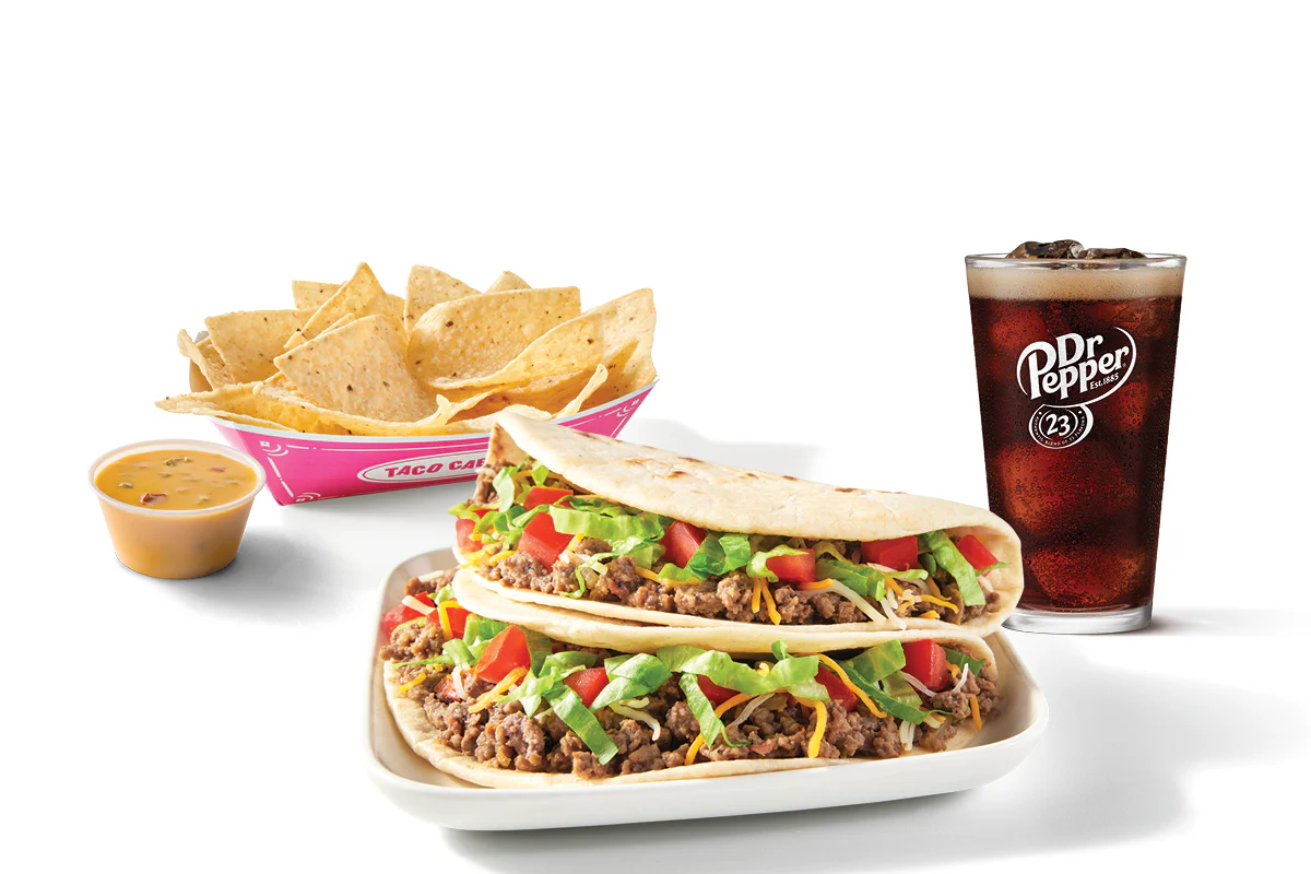Two Ground Beef Tacos, chips & queso and a 20 oz. drink.
