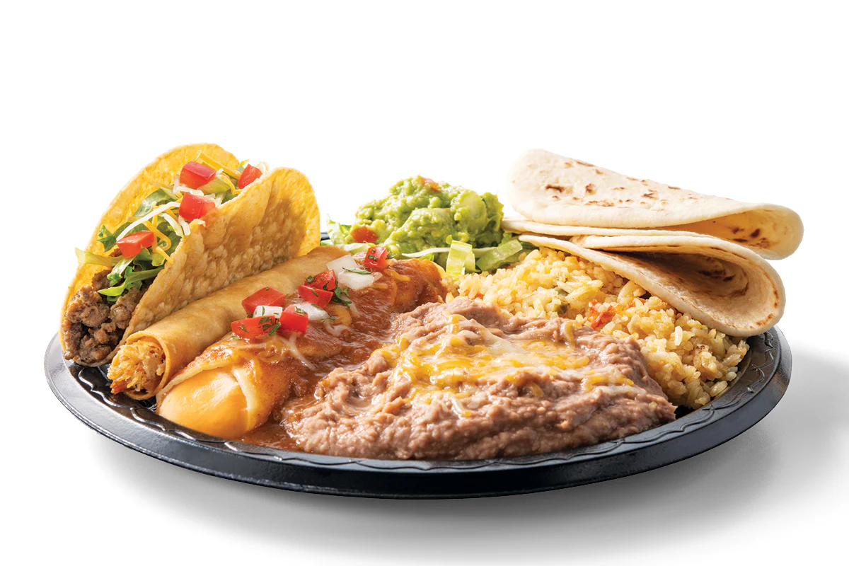Chicken flautas and choice of queso, guacamole or sour cream for dipping. » Combos served with chips and queso and a small drink. » Plates served with rice and beans, guacamole, and your choice of tortillas.