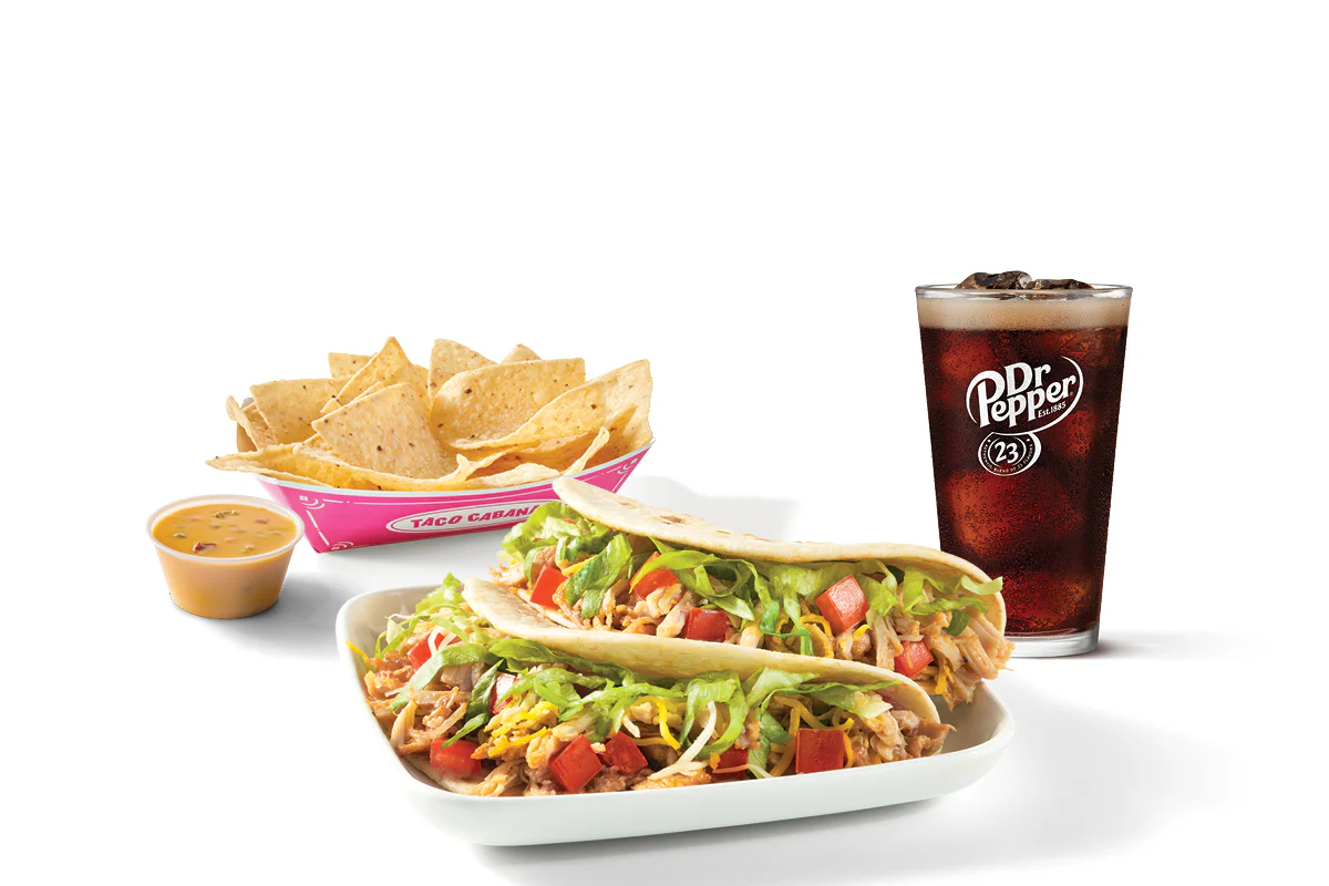 Two Shredded Chicken Tacos, chips & queso and a 20 oz. drink.