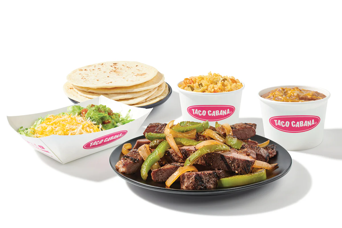 1/2 Order (8 oz) (Steak Fajita) served with a blend of grilled peppers and onions, 8 oz rice, 8 oz refried or black beans, 6 flour tortillas, shredded lettuce, shredded cheese and guacamole.