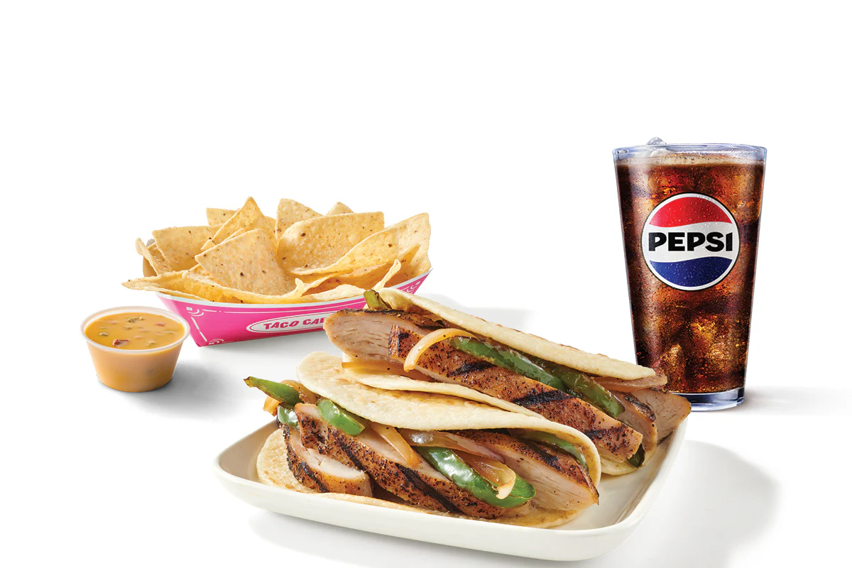 Two Chicken Fajita Tacos with grilled peppers and onions, chips & queso and a 20 oz drink