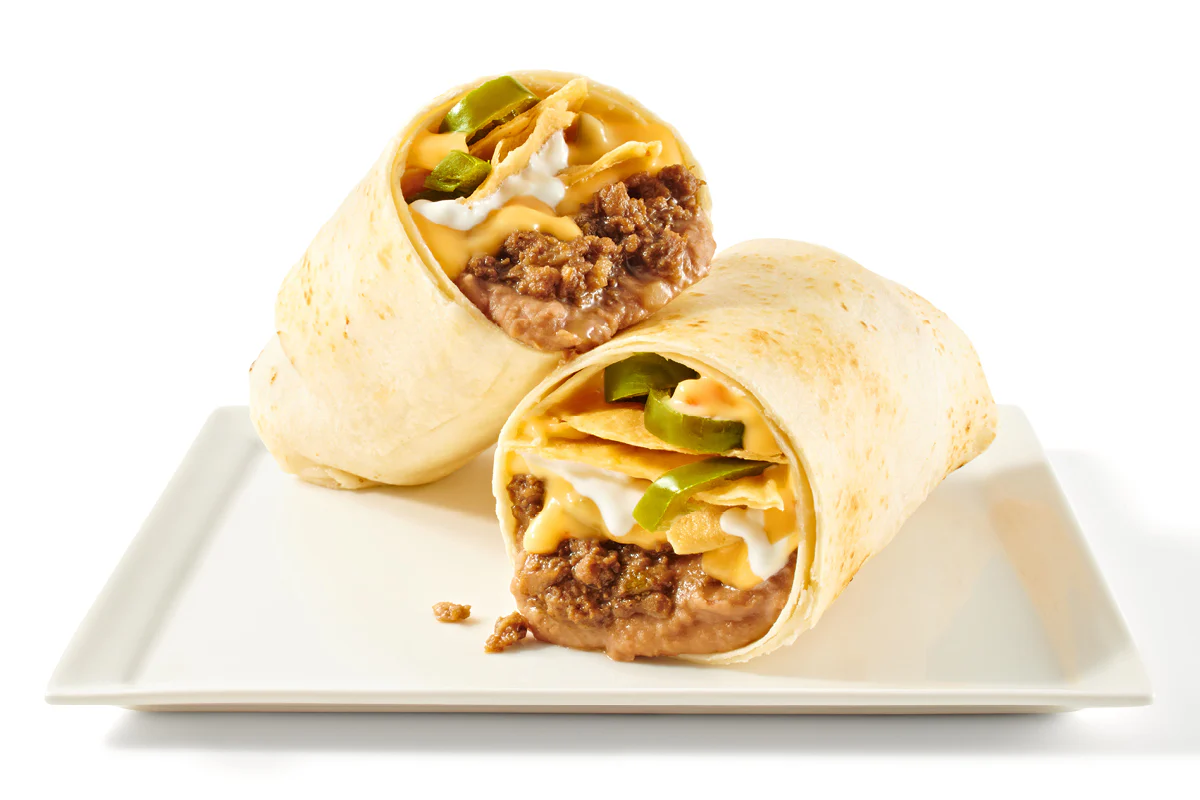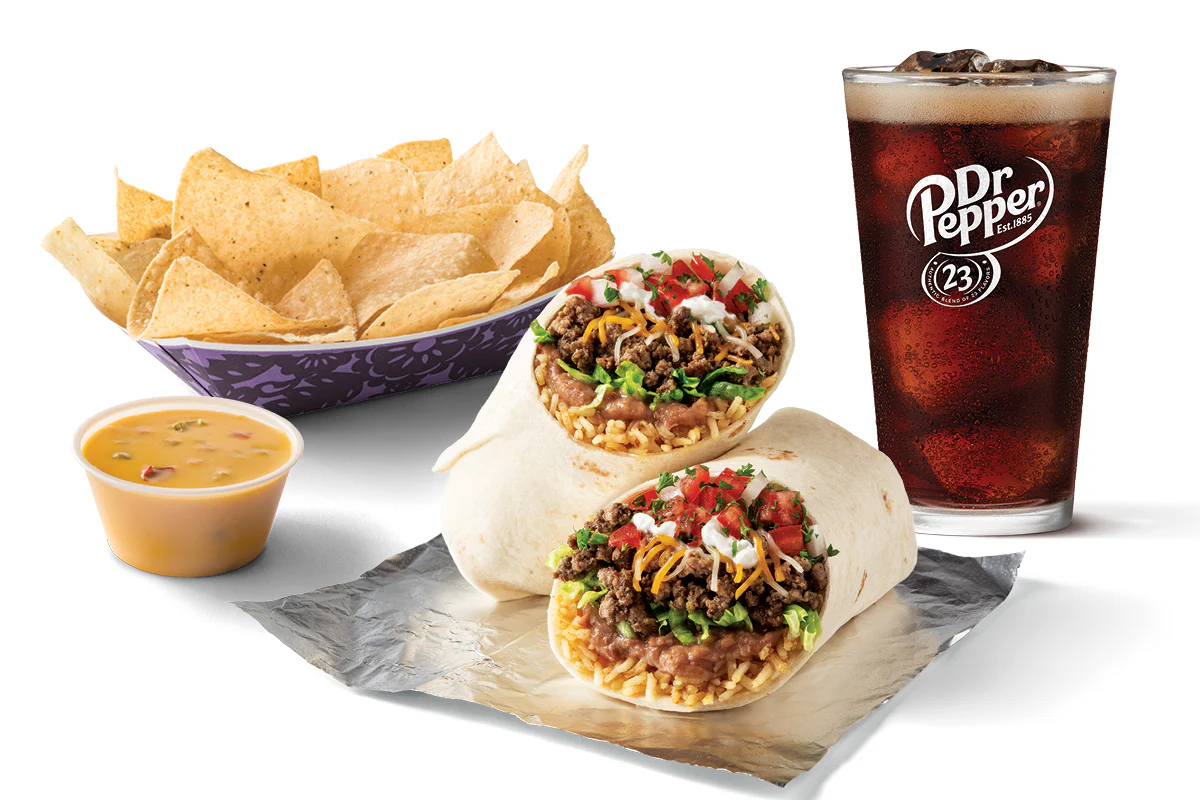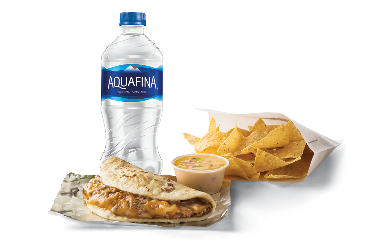 Burrito, chips & queso and a 20 oz. drink.