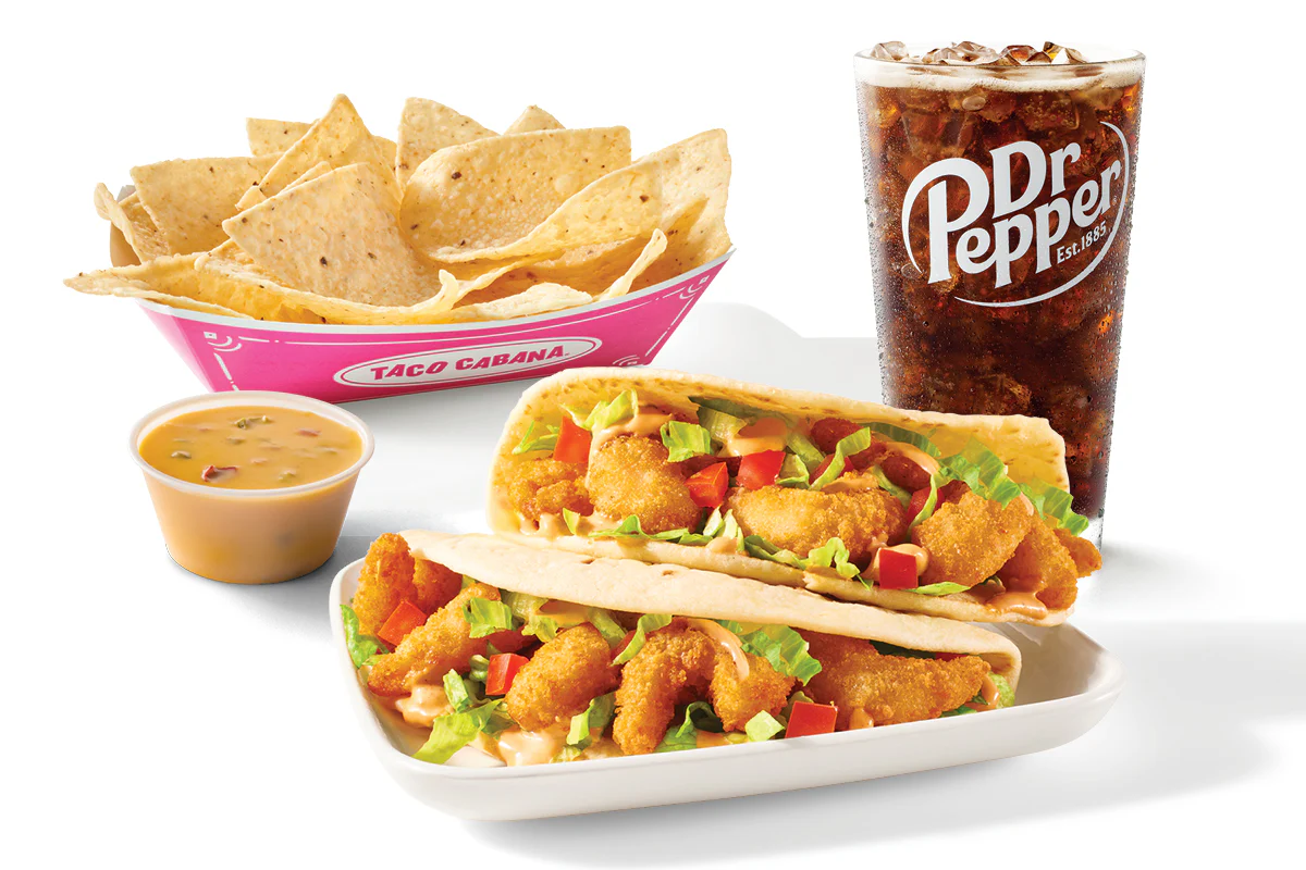 Crispy popcorn shrimp topped with lettuce, tomato and chipotle ranch. > Combo served with chips and queso and a small drink > Plate served with rice and choice of beans, guacamole, and your choice of tortillas