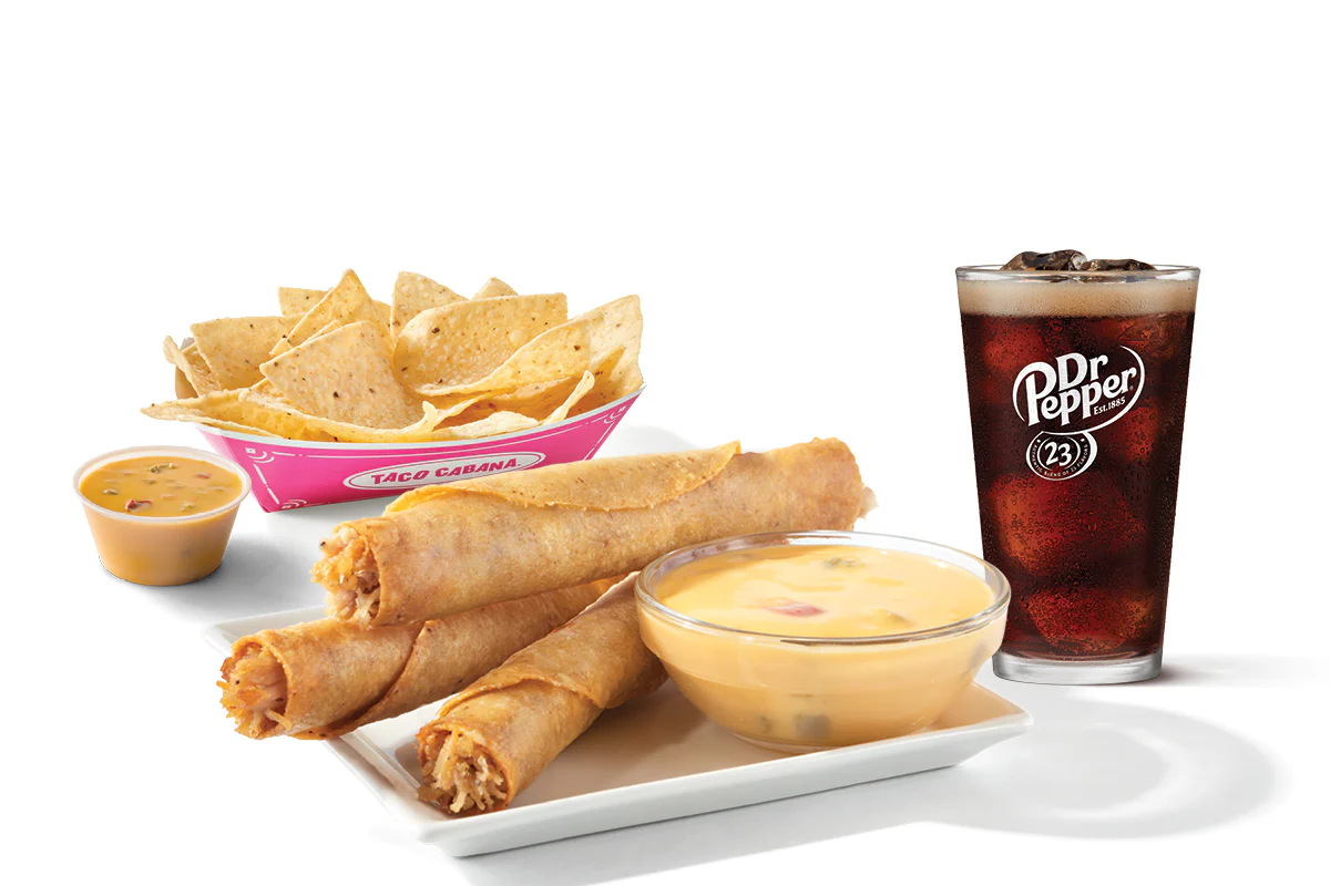 3 crispy Chicken Flautas, chips & queso and a 20 oz drink.