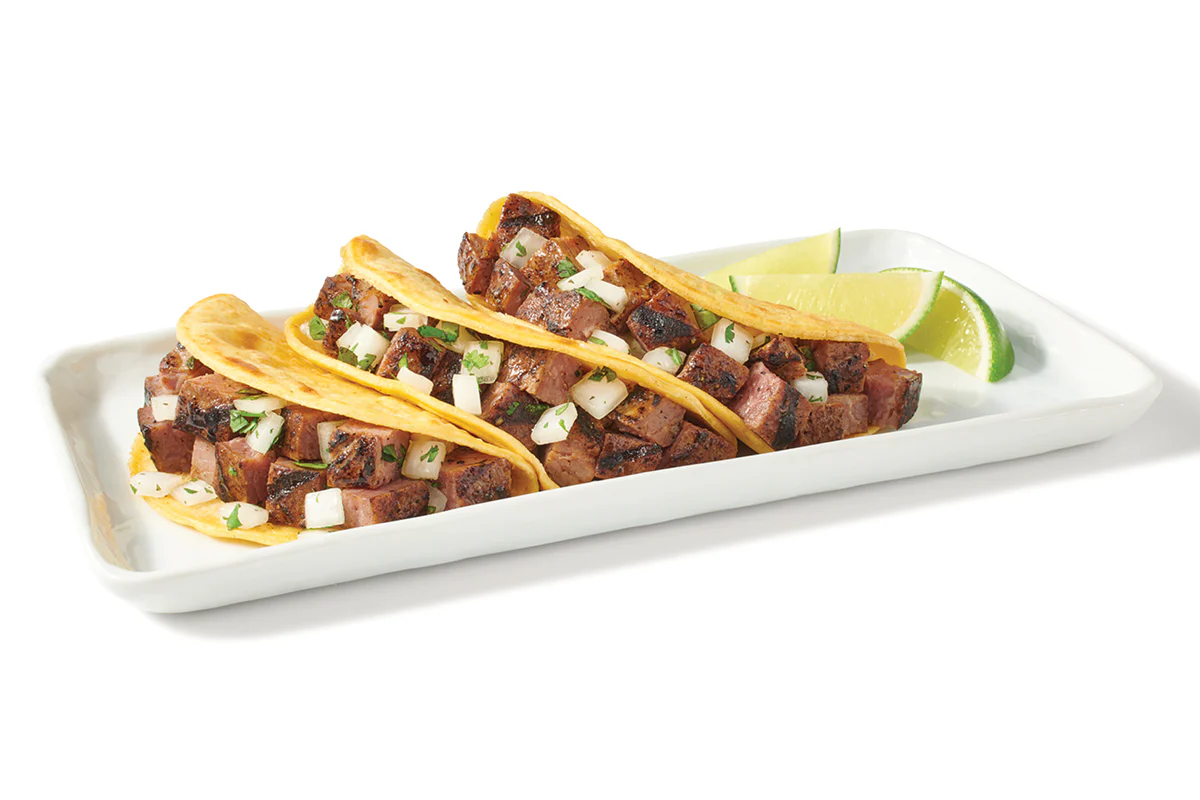 Three corn tortilla street tacos filled with steak fajita, topped with cilantro and onion. » Combos served with 3 tacos, chips and queso and a small drink. » Plates served with 3 tacos, rice and beans, guacamole, and your choice of tortillas.