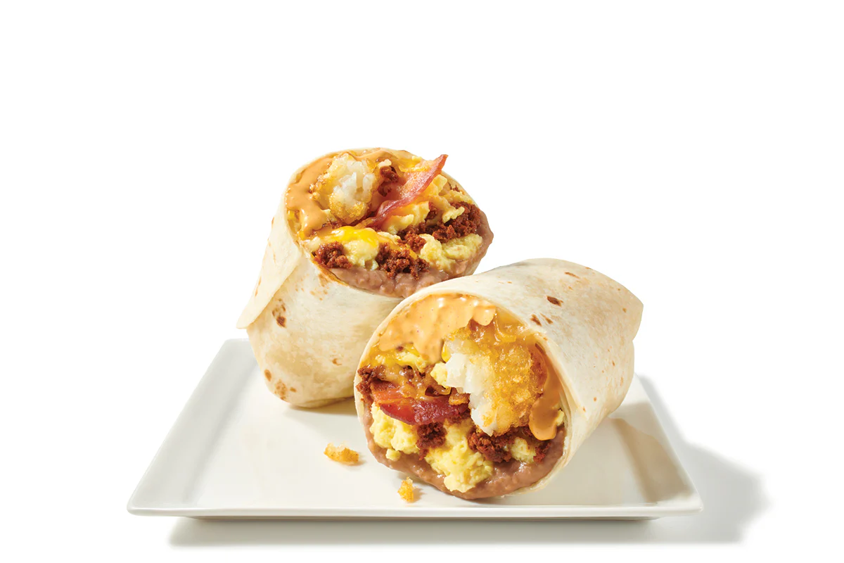 10" tortilla loaded with refried beans, chorizo & egg, bacon, hashbrowns, shredded cheese, then topped with chipotle ranch dressing.