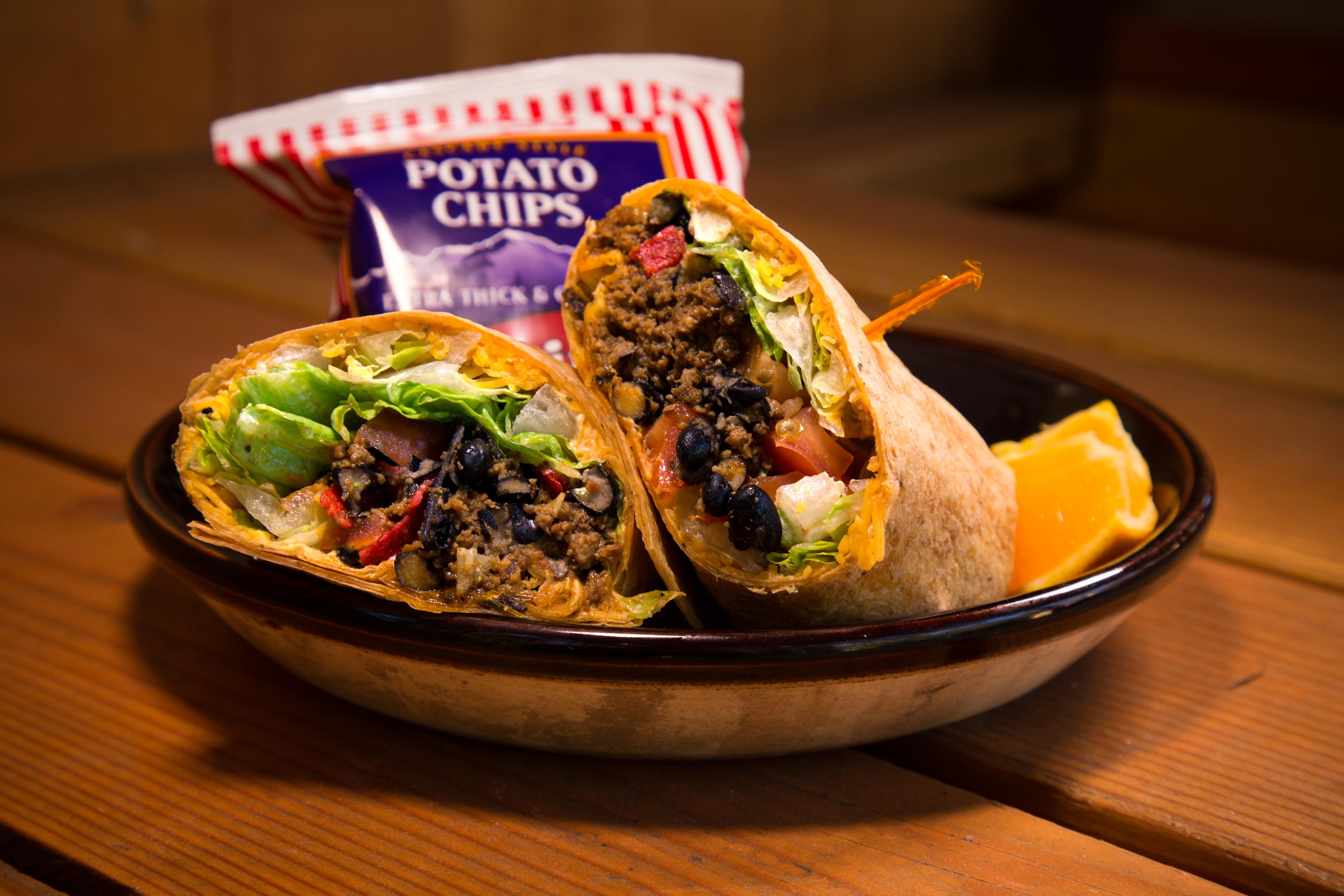 Ground beef, cheddar, tomato, tromaine, black beans, tortilla strips & chipotle spread served w/ salsa and wrapped in a jalpeno tortilla.