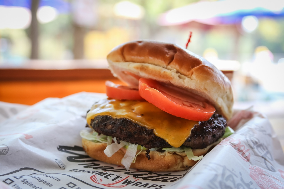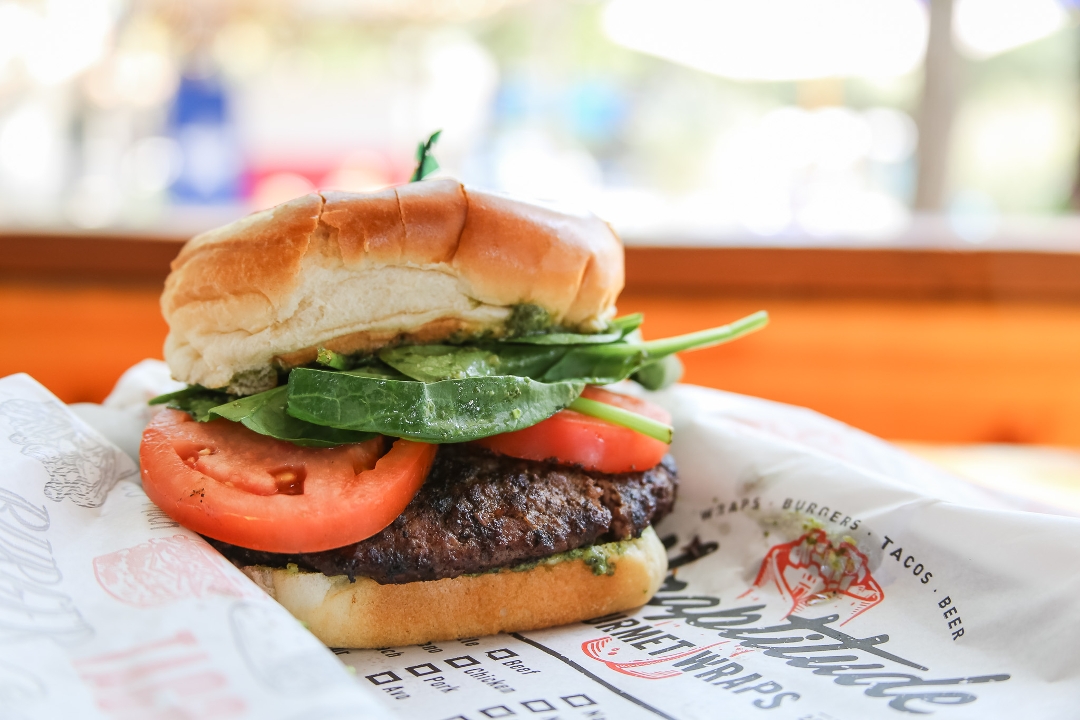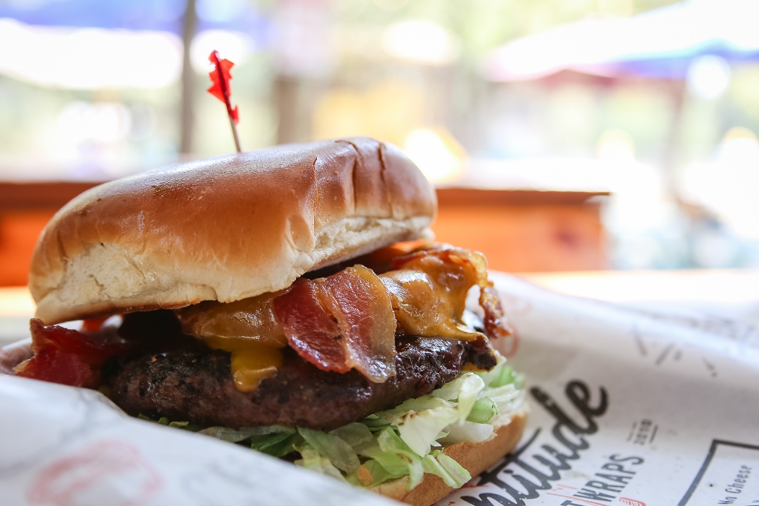 Juicy burger, bacon, lettuce, tomato, onion, pickle, fry sauce, cheddar and fries inside wrapped in a garlic-herb tortilla