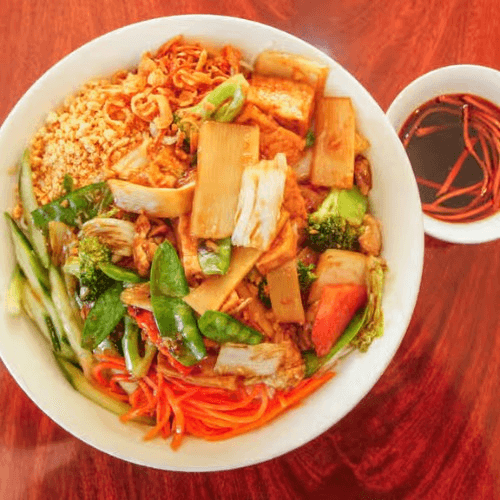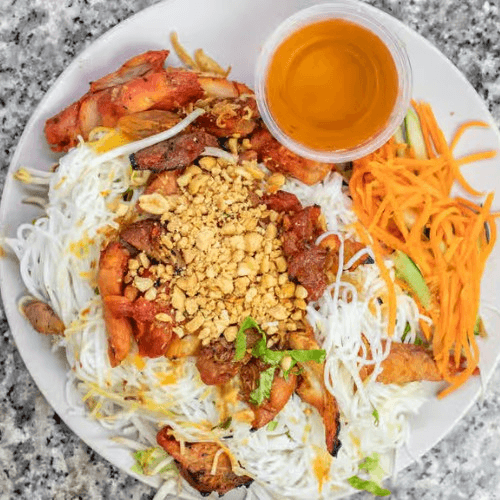 Served with bean sprouts, lettuce, cucumber, green and fried onions, peanuts, carrots, and fish sauce