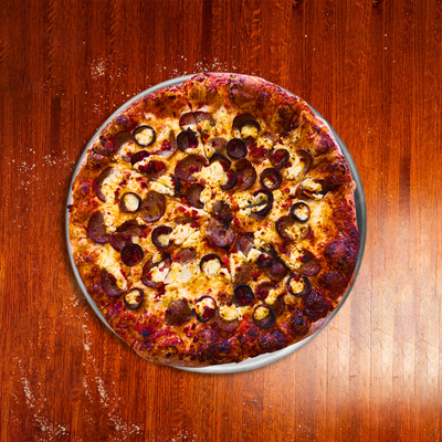 Pepperoni, Italian sausage, green bell peppers, onions, roasted mushrooms and black olives. Red pizza sauce and premium 100% Mozzarella Cheese. Serves up to 4 guests.