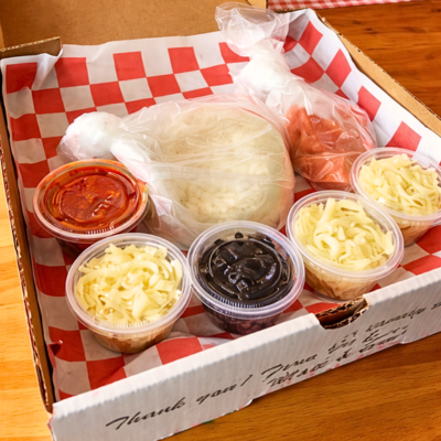 Build your own pizza. Top it as you wish. Our dough is made in house from scratch: Unbleached flour, water, oil, yeast, salt and sugar (to activate yeast). We SHRED our premium quality Mozzarella cheese in house for you, and make sauce made out of fresh tomatoes. YUM! Serves up to 6 Guests. >> Please add any special requests below.