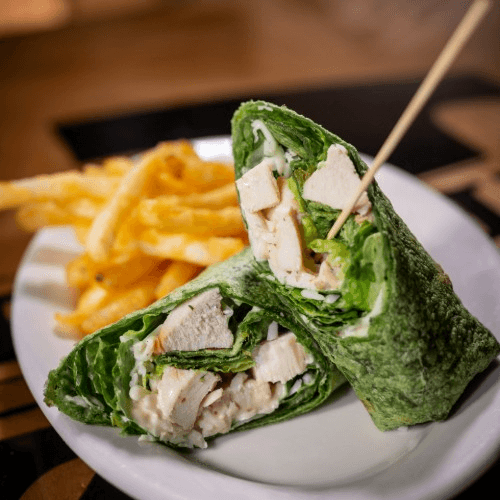 A garlic spinach wrap with baked chicken, crisp romaine lettuce, grated parmesan cheese, drizzled with Caesar dressing & served with fries