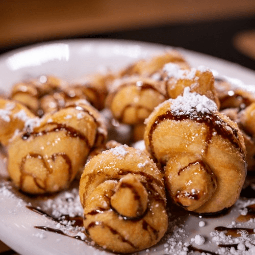 Twisted dough knots drizzled with chocolate & dusted with powdered sugar
