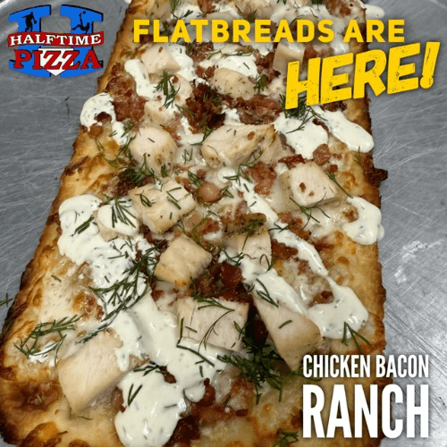 Crispy flatbread brushed with rich margarine, layered with rich mozzarella, tender diced chicken and smoky bourbon bacon. Baked to golden perfection, cut into shareable squares, and finished with a drizzle of creamy Halftime Pizza ranch and a sprinkle of fresh dill.