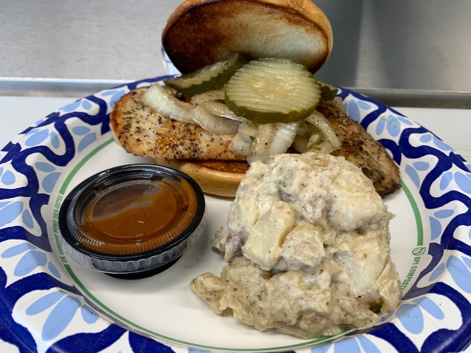 Dry brined pan seared chicken breast on a toasted bun. Served with homemade pickles, barbecue sauce and marinated onions. Comes with one side.