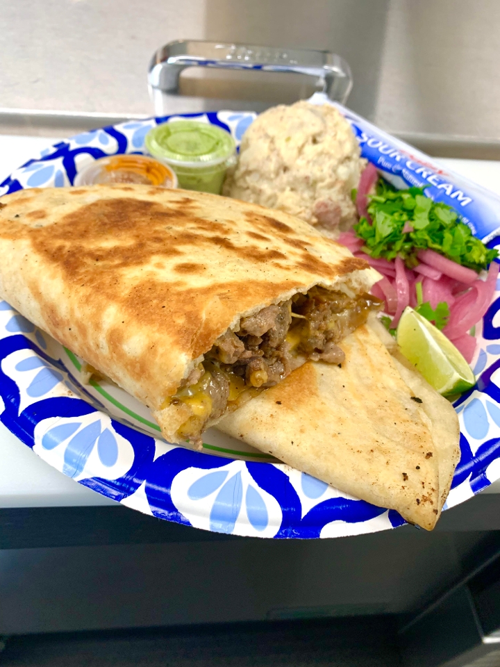 Angus choice carne asada and three cheese blend melted on a 11" inch flour tortilla and served with pickled red onions and fresh cilantro plus one side. Comes with spicy red salsa, our signature green salsa and sour cream.