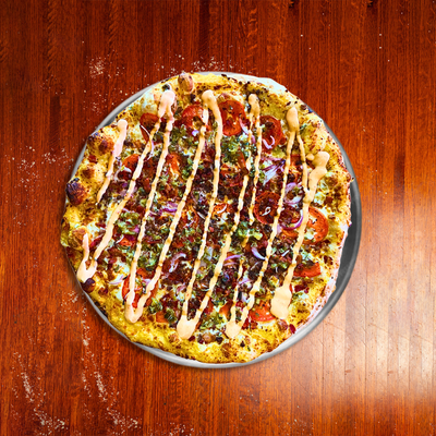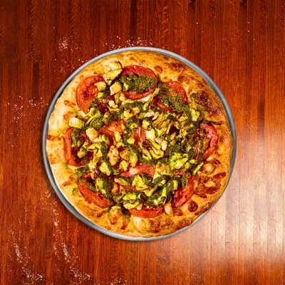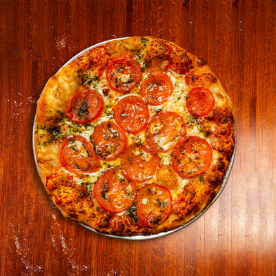 Sliced Roma Tomatoes, Basil Oil Drizzle, Pizza Sauce and premium 100% Mozzarella Cheese.
