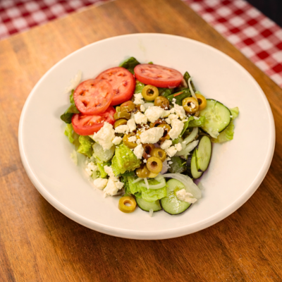 Romaine Lettuce, Roma tomatoes, sliced onions, cucumbers, topped with imported Spanish green olives and feta cheese.