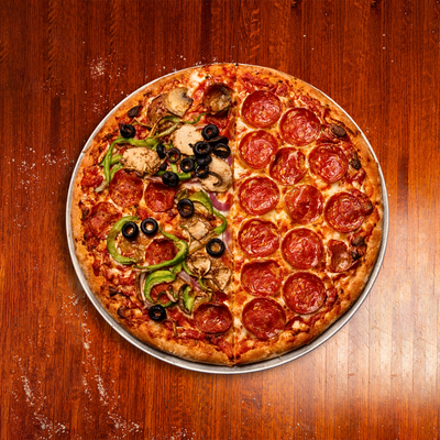 Pepperoni, Italian sausage, green bell peppers, onions, roasted mushrooms and black olives. Red pizza sauce and premium 100% Mozzarella Cheese. Serves up to 6 guests.
