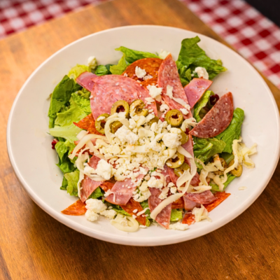Romaine Lettuce, Spanish imported green olives, artichokes, feta cheese & sliced Pepperoni, Canadian Bacon and mozzarella cheese. (Pictured: small Antipasto)