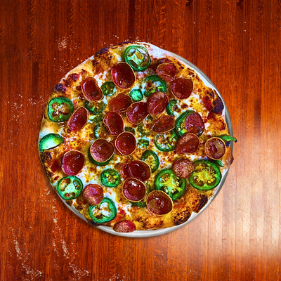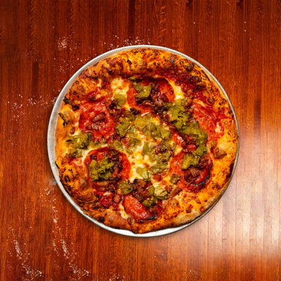 Pepperoni, Bacon, Hatch Green Chile (harvested from Hatch, NM). Red pizza sauce and premium 100% Mozzarella Cheese. Serves up to 4 guests.
