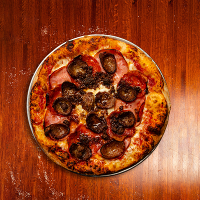 Pepperoni, Italian sausage, roasted ground beef, Canadian Bacon. Red pizza sauce and premium 100% Mozzarella Cheese. Serves up to 4 guests.