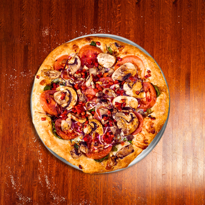 Sliced tomatoes, a layer of fresh spinach, roasted mushroom, onions, diced red bell peppers, premium 100% Mozzarella Cheese. (This is a Bianca pizza, comes with no red pizza sauce). Serves up to 4 guests.