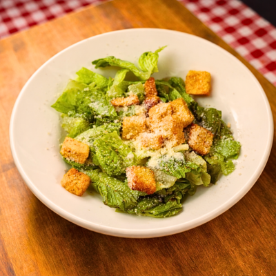 Romaine lettuce topped with Parmesan cheese and croutons served with a side of Caesar dressing