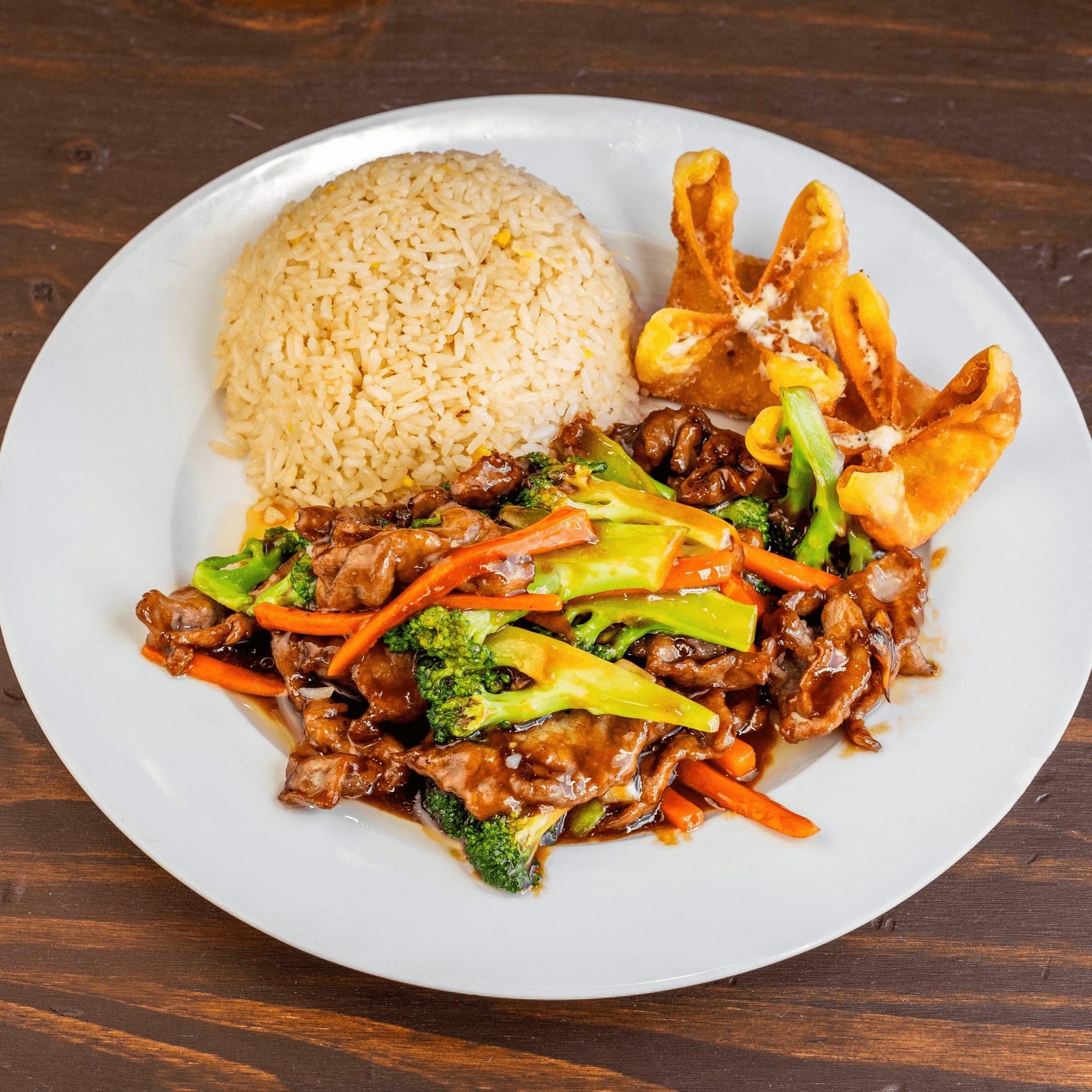 Served with Steamed Rice or Fried Rice, 2 Cheese Rangoons, & Iced Tea