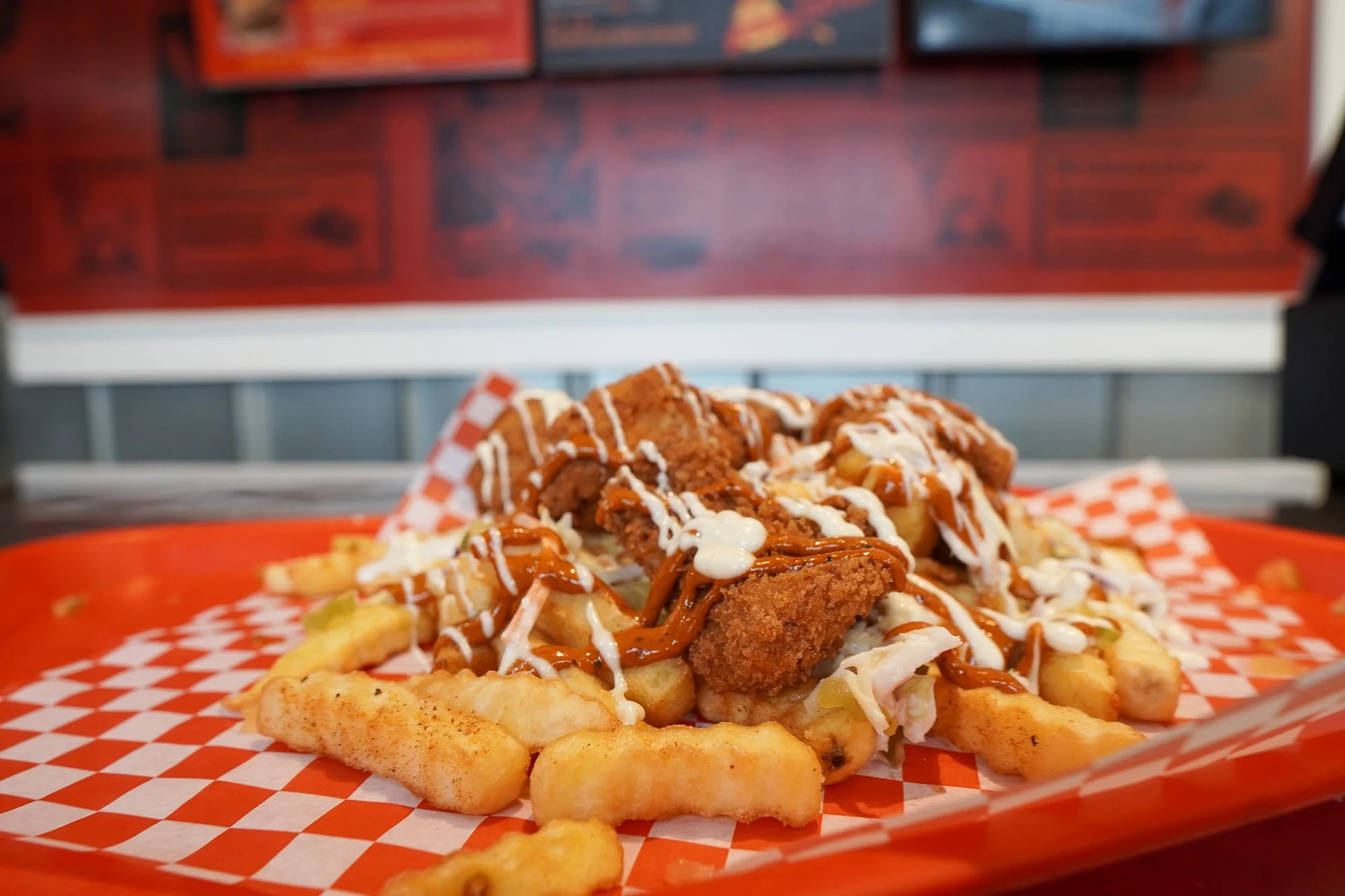 Kimchi, katsu bite, Monterrey jack cheese, cheese sauce, served on top of our crinkle cut fries with chipotle ranch, kung-fu sauces