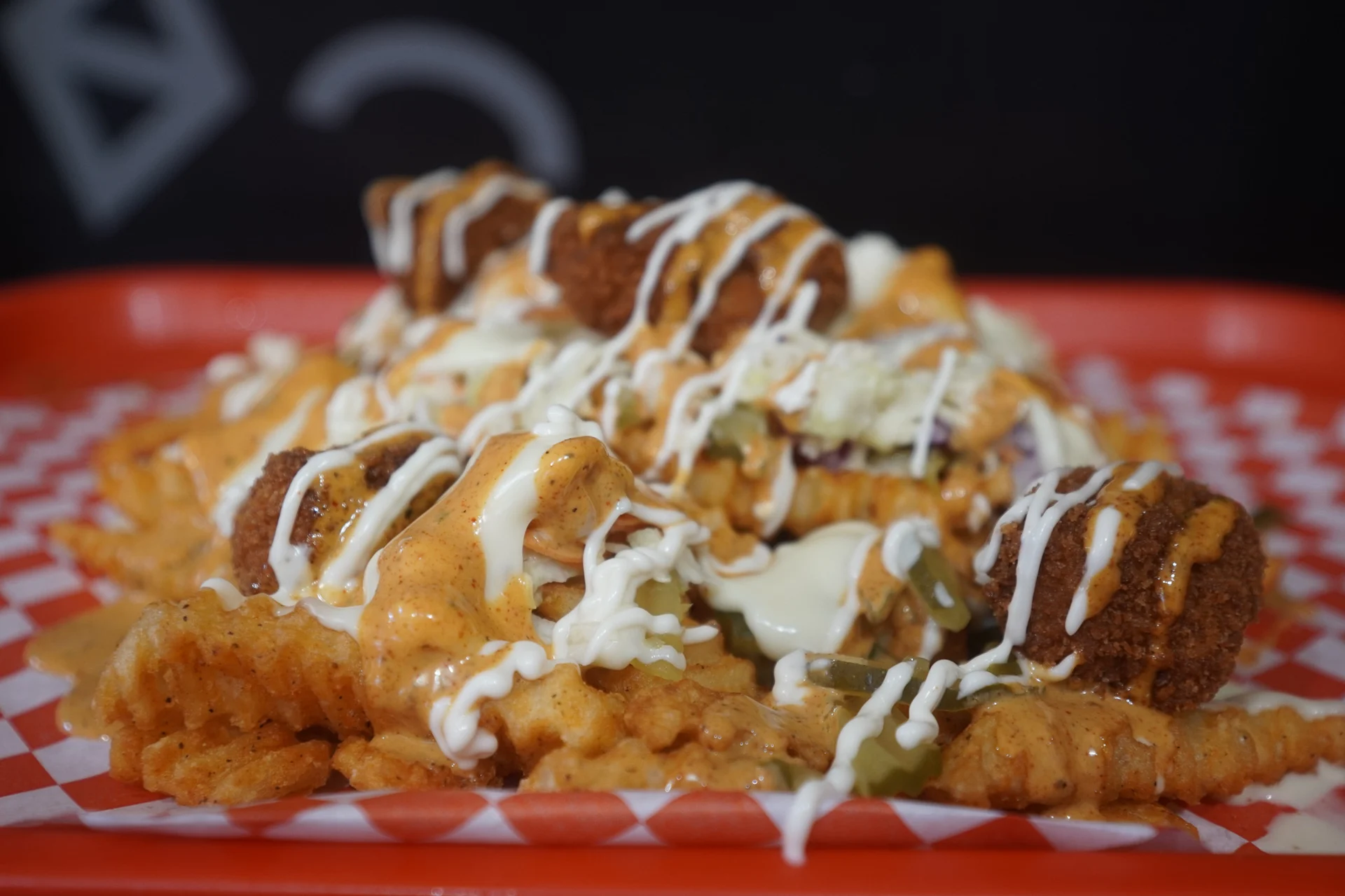 Katsu bites, pickles, kewpie slaw, cheese sauce, served on top of our crinkle cut fries with kung-fu sauce and kewpie mayo