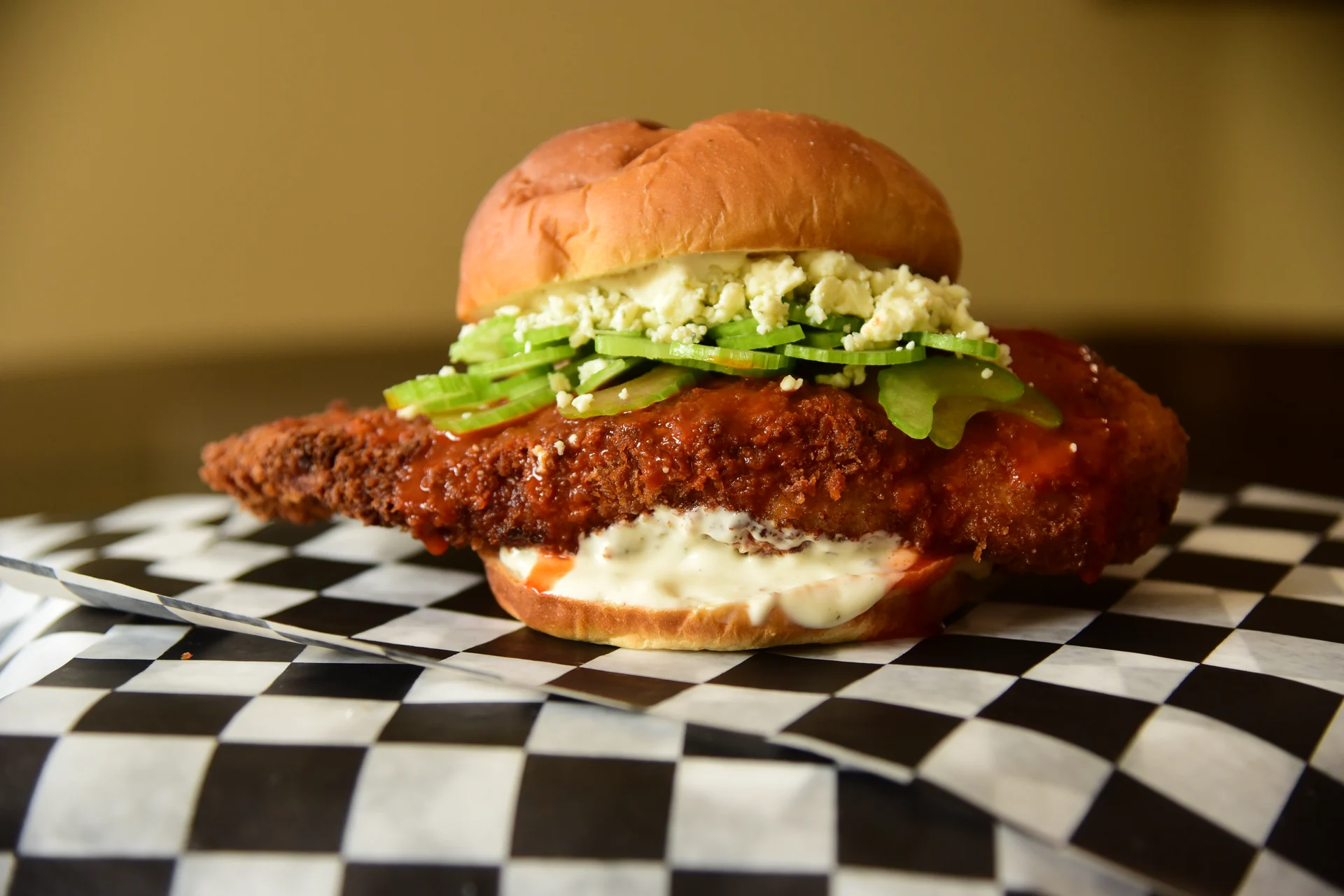Herb brined panko breaded chicken breast, tangy buffalo sauce, ranch, blue cheese crumbles, thinly sliced celery on our signature scratch-made ono bun