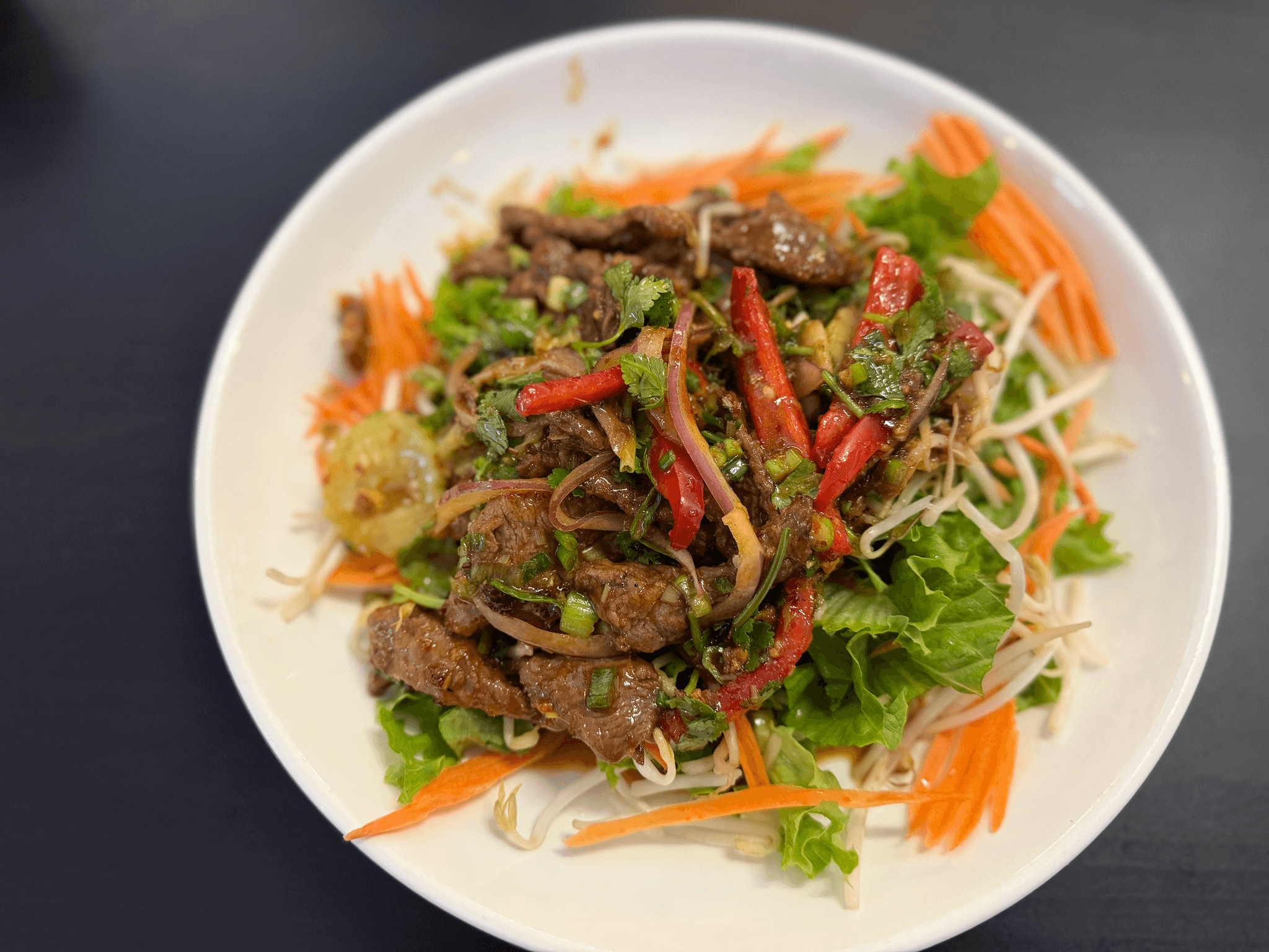 Means Great Fortune! Traditional Thai Lao dish, minced grilled chicken seasoned with freshly squeezed limes, lemon grass, red onions, cilantro & scallions