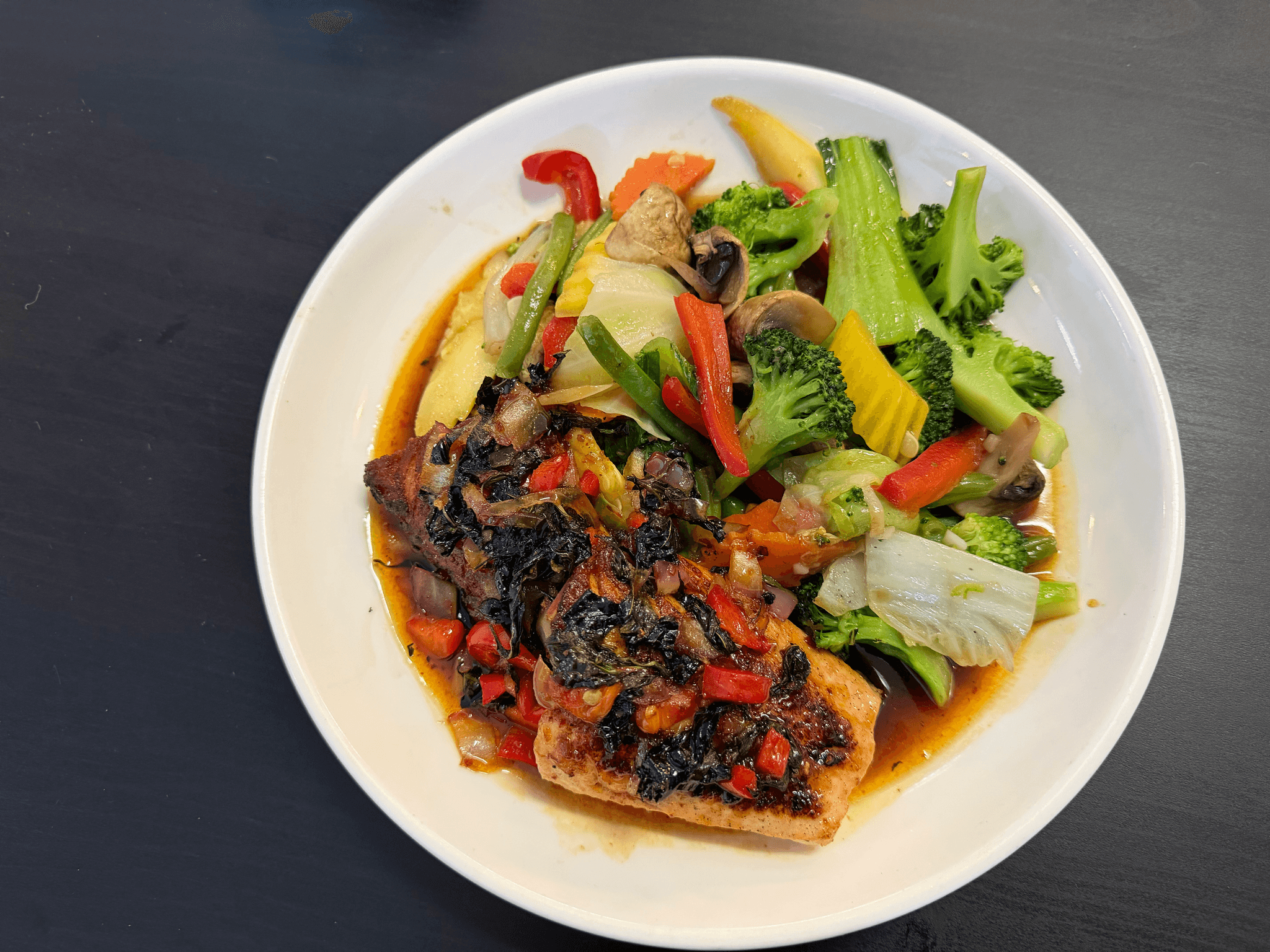 Stir-fried green beans, mushrooms, zucchini, bell peppers, & accentuated with basil